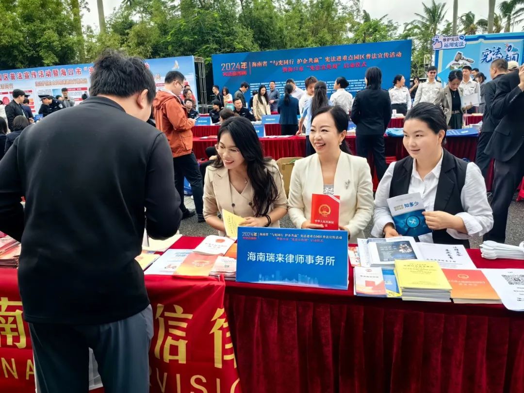 2024年12月2日上午,海南省“与宪同行 护企共赢”宪法进重点园区普法宣传活动暨海口市2024年“宪法宣传周”在海口市复兴城互联网信息产业园启动,瑞来作为海南律所代表,指派车玲律师、张颖峰律师、林丁丁律师参与了此次普法活动,为园区企业提供法律咨询,宣传宪法、民法典、海南自由贸易港法以及与优化营商环境相关法律法规知识,让园区企业“零距离”“一站式”享受法治资源和法律服务。