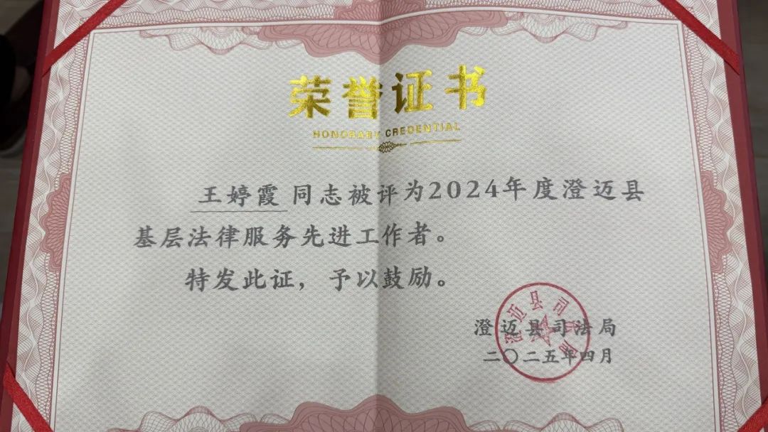 2025年4月,瑞来所王婷霞律师扎实的专业功底和突出的基层服务成效,,荣获澄迈县司法局颁发的"2024年度澄迈县基层法律服务先进工作者"称号。过去一年间,王律师深入村镇社区开展法治宣讲十余场,化解矛盾纠纷数十件。“基层法治工作没有惊天动地,但每解决一个‘小问题’,都是在为法治社会添砖加瓦。”王婷霞律师表示,荣誉既是肯定更是鞭策,将秉持初心持续深耕基层法律服务,当好群众法律权益的"守护者"。