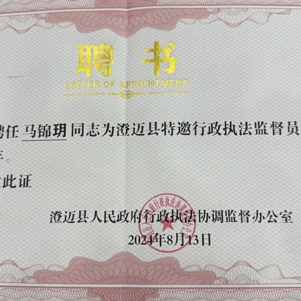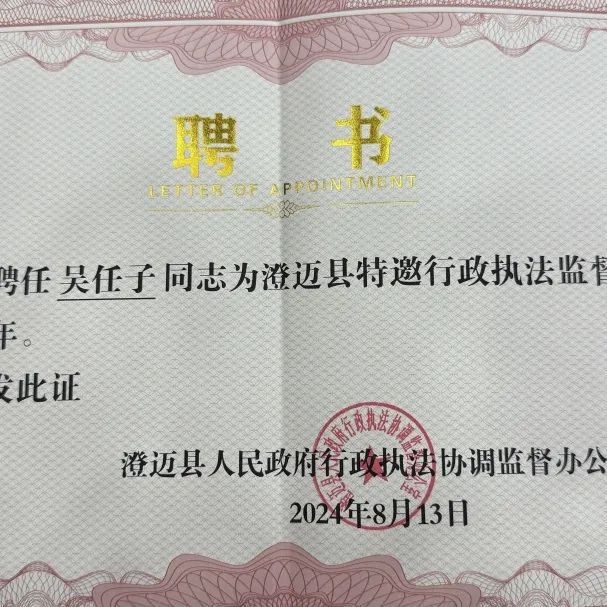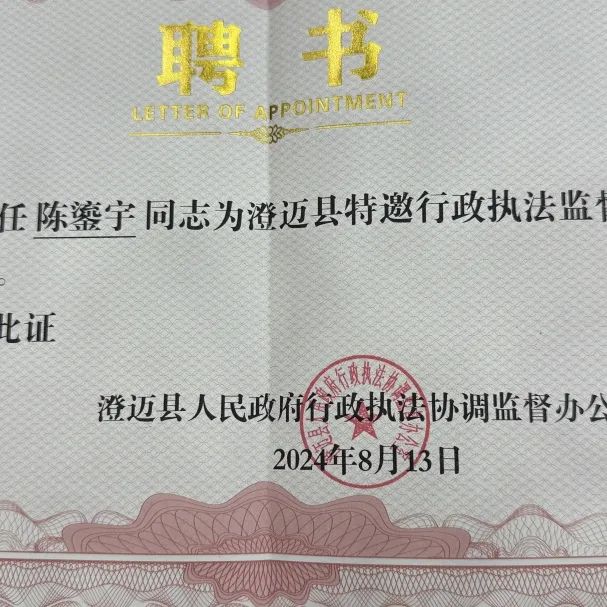 2024年8月13日,澄迈县综合行政执法工作联席会议办公室依据《关于开展特邀法律顾问参与行政执法监督工作方案》,正式聘任海南瑞来律师事务所吴任子、马锦玥、陈鎏宇三位资深律师担任特邀行政执法监督员。她们均具备卓越的法律专业素养与丰富的实务经验,将在两年任期内依照《关于开展特邀法律顾问参与行政执法监督工作方案》,依法对澄迈县行政执法单位及执法人员的执法活动进行独立监督,为提升行政执法公信力建言献策。