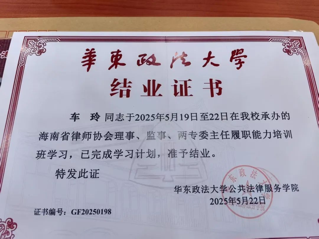 近日,海南省律师协会对外交流委员会副主任、海南瑞来律师事务所金融法律专业委员会主任车玲律师赴华东政法大学参加由海南省律师协会主办的“理事、监事、两专委主任履职能力培训班”。此次培训旨在提升海南省律师行业管理水平和专业素养,促进律师队伍高质量发展,为海南自贸港法治建设注入新动能。