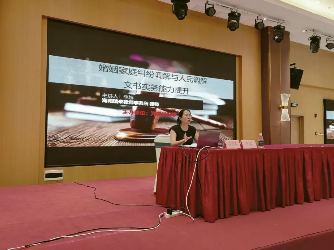 为积极履行社会责任,深度参与法治海南建设与基层社会治理,海南瑞来律师事务所李娇律师应海南省妇女联合会邀请,于2025年6月25日为全省妇联系统主席干部及司法局部分干部近百余人进行专题授课。本次授课聚焦“婚姻家庭纠纷调解与人民调解文书实务能力提升”,旨在运用本所专业力量,助力提升相关公职人员的调解专业水平和实务操作能力,为构建和谐家庭、维护社会稳定贡献力量。