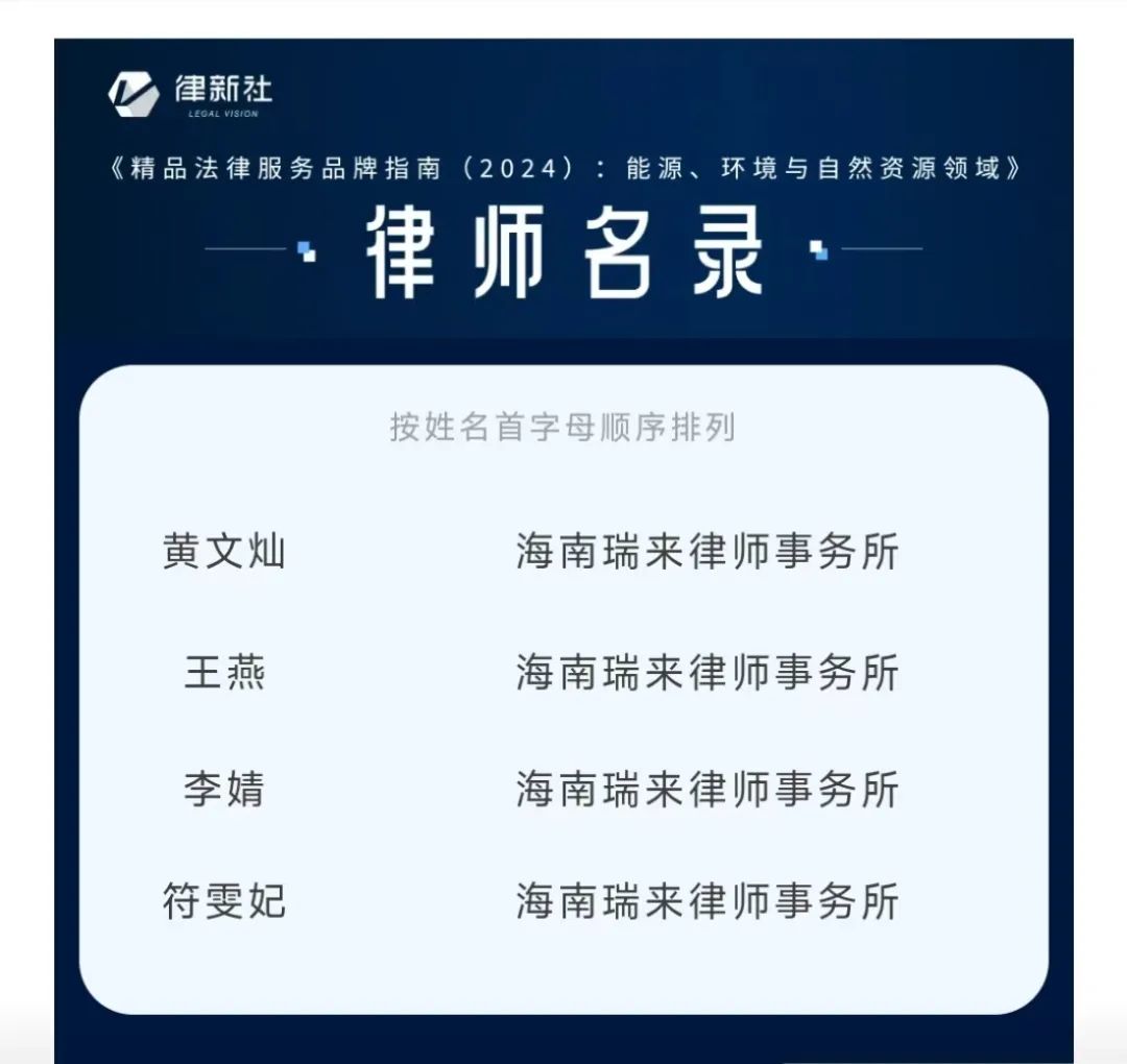 海南瑞来律师事务所四位律师的入选,不仅是对他们个人专业能力的肯定,也是对海南瑞来律师事务所在能源、环境与自然资源法律服务领域卓越实力的认可。律所不断提升法律服务质量和水平,为客户提供更加优质、高效的法律服务。
