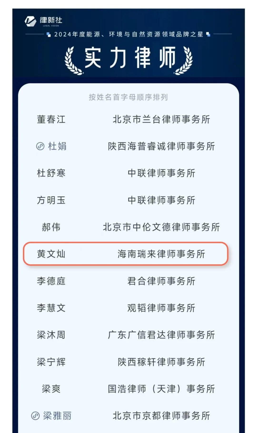 海南瑞来律师事务所主任黄文灿荣获“律新社2024年度能源、环境与自然资源领域品牌之星:实力律师”荣誉奖项。