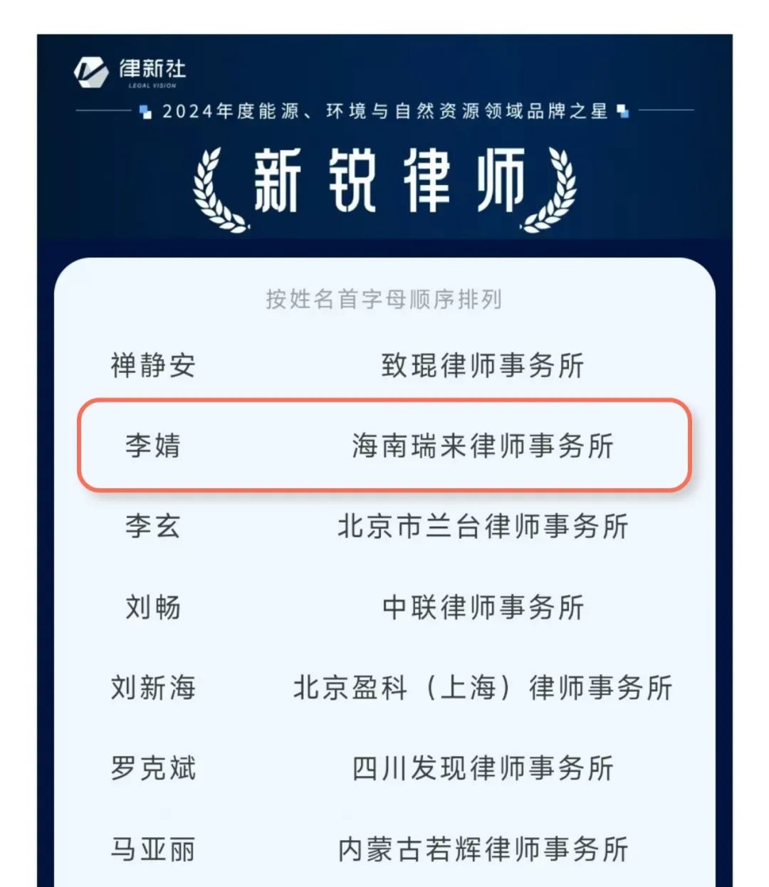 海南瑞来律师事务所李婧律师荣获“律新社2024年度能源、环境与自然资源领域品牌之星:新锐律师”荣誉奖项。